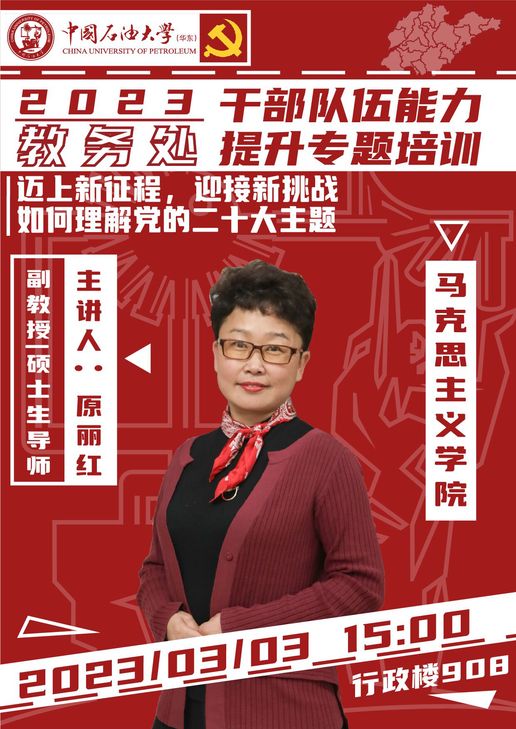 为贯彻落实学校新学期工作会精神,深入实施新时代人才强校战略,着力打造堪当重任的高素质干部队伍,保障可持续高质量发展,3月3日,教务处(william威廉中文官网)2023年干部队伍能力提升专题培训第1期正式开讲,邀请马克思主义学院原丽红副教授解读党的二十大精神,教务处(william威廉中文官网)全体人员参加学习。